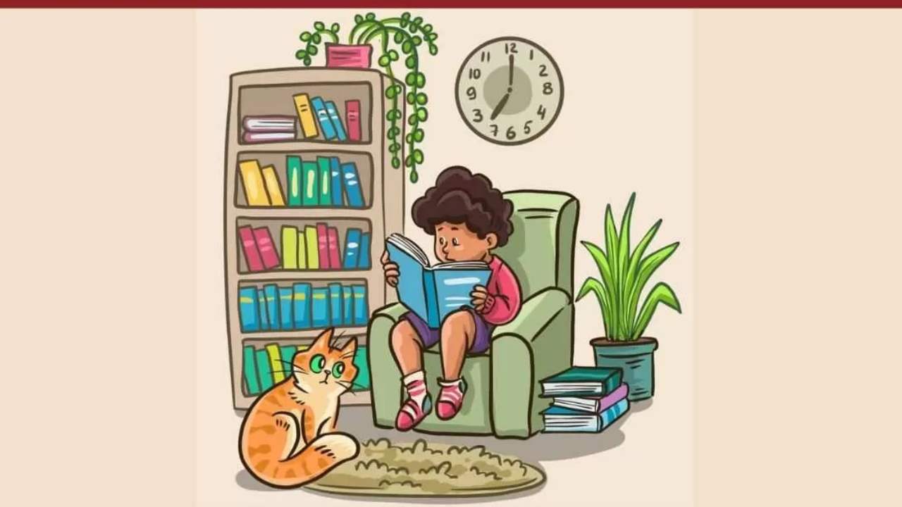 Na imagem, vemos um garoto sentado confortavelmente em um sofá, lendo um livro, enquanto seu gato repousa ao lado. Apesar de ser uma cena aparentemente comum, um detalhe sutil está fora do lugar. Sua tarefa é identificar o erro no menor tempo possível.