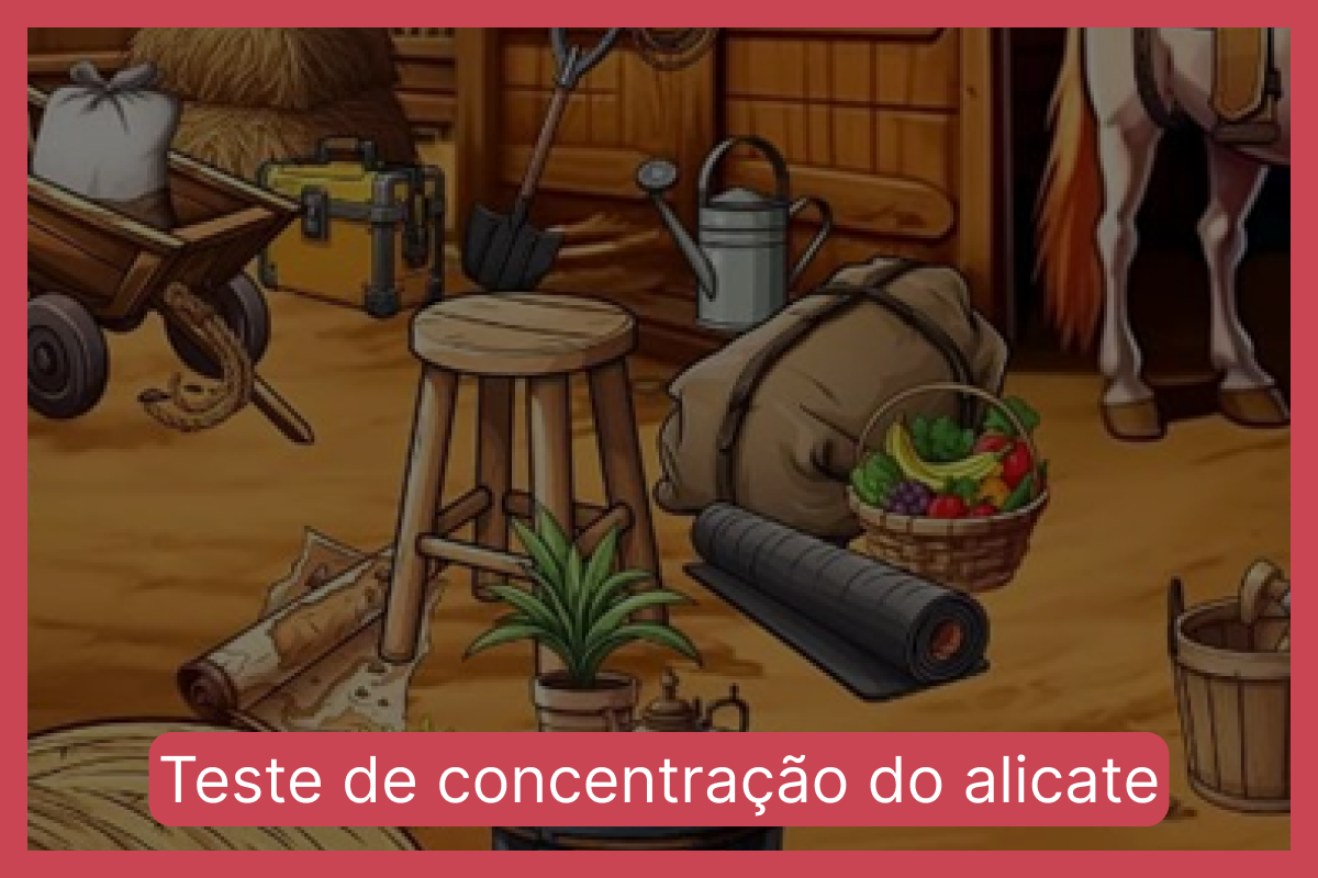 Na figura abaixo, você verá um estábulo cheio de elementos espalhados de forma desorganizada. Em algum lugar desse cenário, há um alicate perdido. Sua missão é localizar a ferramenta em menos de 10 segundos. Para isso, você precisará ignorar todas as distrações ao seu redor e focar na imagem para localizar o alicate rapidamente. E então, será que você tem a capacidade visual e a agilidade necessárias para completar essa tarefa em tão pouco tempo?