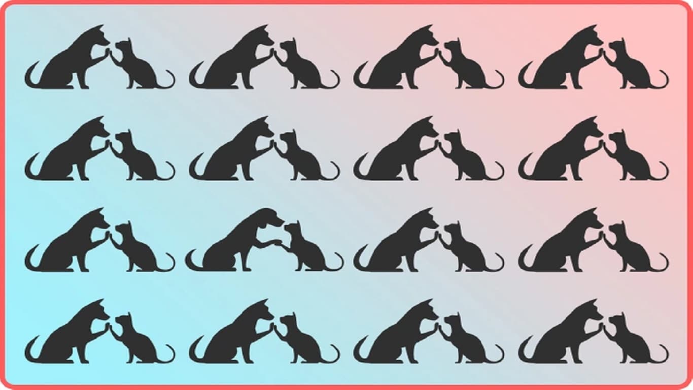 Prepare-se para o desafio de hoje que vai testar sua percepção! Observe com bastante atenção a imagem com múltiplos pares de silhuetas de cães e gatos se tocando. Existe uma dupla fora do padrão entre cães e gatos para você identificar nesta imagem. Você consegue achar em até 10 segundos?