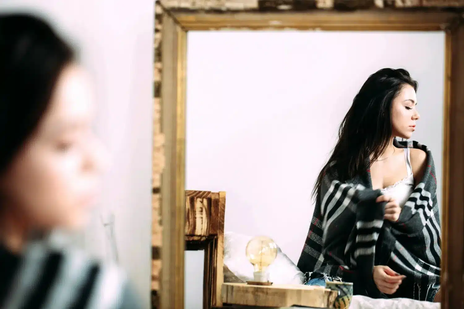 Mulher observando seu reflexo no espelho, ilustrando narcisismo em teste de personalidade.