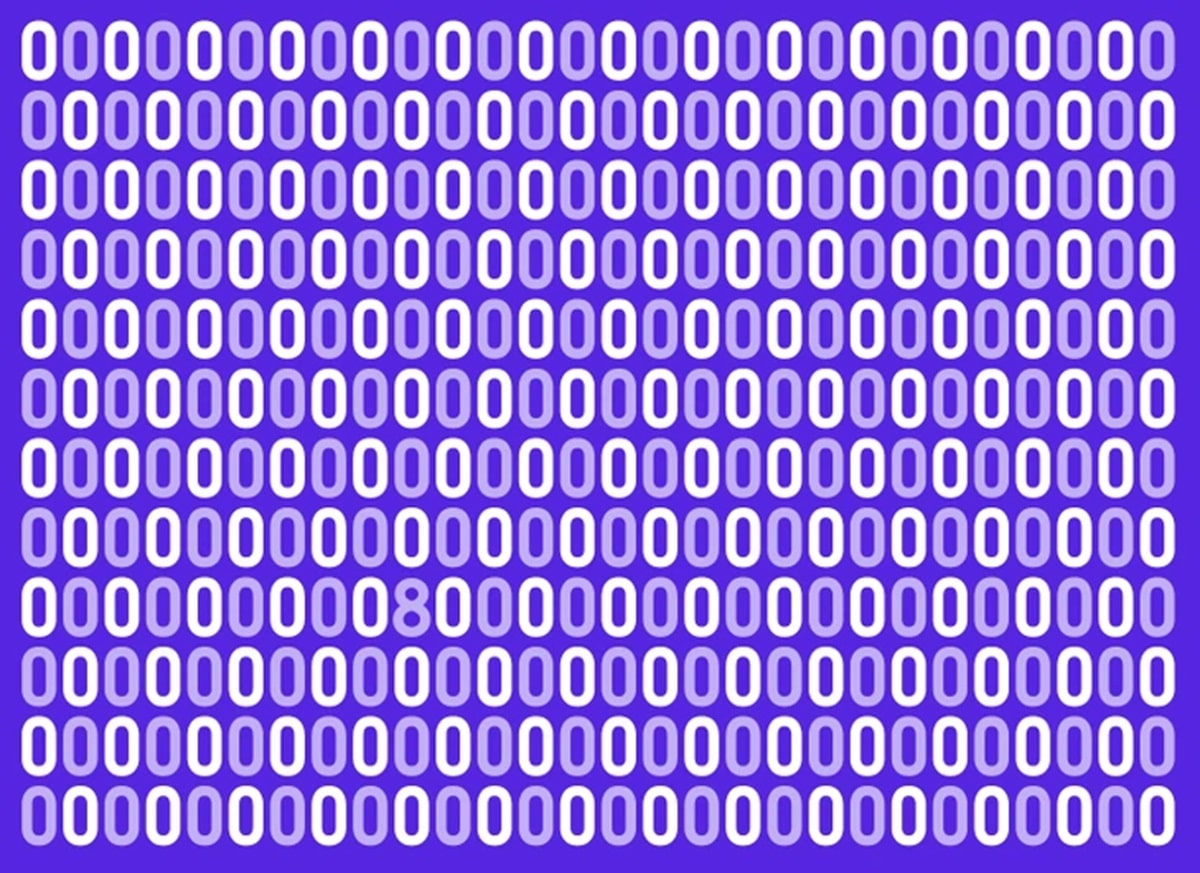 Prepare-se para o desafio de hoje, que vai testar sua percepção! Observe com bastante atenção, a imagem mostra uma ilustração composta por várias linhas de zeros brancos em um fundo roxo. Entre tantos zeros, há um número 8 camuflado. Você consegue achar o número 8 camuflado em até 25 segundos?
