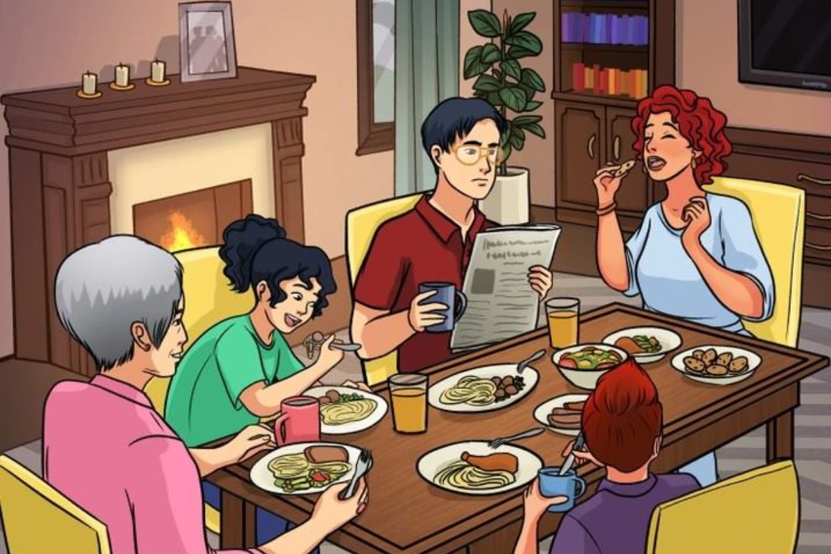 A imagem mostra uma cena de jantar em família, com cinco pessoas sentadas ao redor de uma mesa repleta de alimentos variados. Na mesa, há variados pratos. Cada membro da família está interagindo de maneira única, aproveitando a refeição de maneiras diferentes.