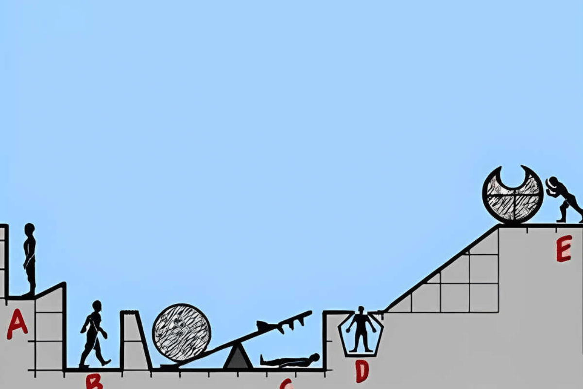 A imagem apresenta um desafio visual intrigante, no qual cinco personagens, identificados pelas letras A, B, C, D e E, estão posicionados em uma sequência de eventos perigosos. A ilustração sugere que um evento desencadeará uma reação em cadeia, levando à queda de um grande objeto esférico e, possivelmente, resultando na morte de um ou mais personagens.