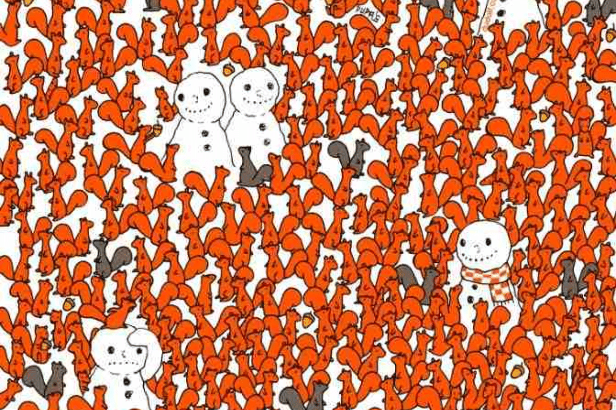 Na imagem, uma multidão de esquilos laranja preenche a cena, criando uma espécie de “muralha” de esquilos em um fundo branco. Entre eles, há dois bonecos de neve, um deles com um cachecol e o outro com um nariz laranja. Além dos esquilos e bonecos de neve, há algumas pequenas pistas adicionais, como um esquilo de cor diferente e pequenos detalhes espalhados por toda a imagem.
