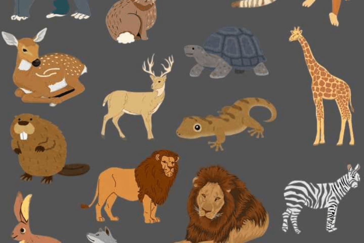 A imagem mostra uma variedade de animais terrestres e selvagens organizados sobre um fundo cinza. Entre as espécies presentes, há leões, tigres, girafas, zebras, raposas, macacos e muitos outros. No entanto, há um detalhe curioso: um dos animais não pertence ao mesmo ambiente dos demais.