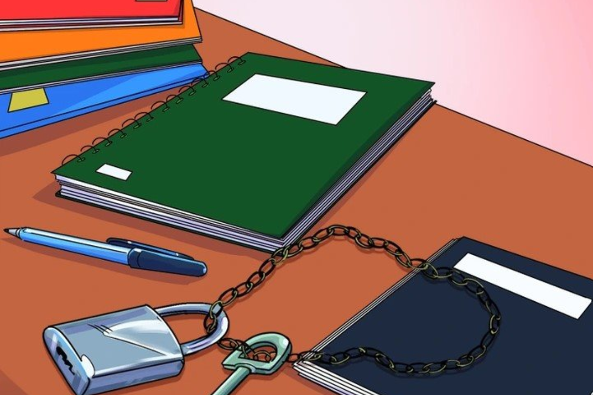 A imagem mostra uma mesa de estudo organizada com alguns cadernos coloridos, uma caneta, uma corrente de metal e um cadeado com sua respectiva chave. Tudo parece estar em ordem, mas há um erro escondido que desafia a atenção aos detalhes.