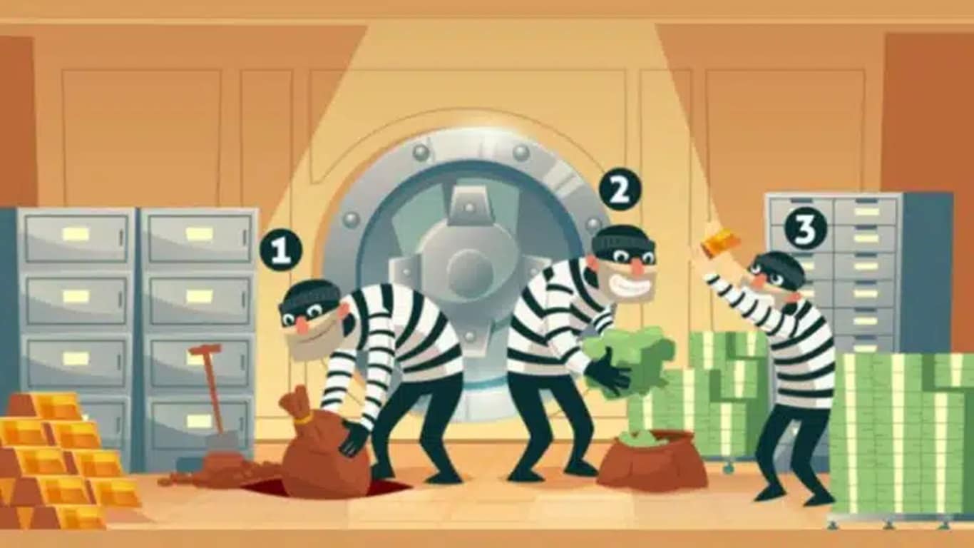 Teste de QI com três ladrões roubando um cofre, com o número 3 segurando um lingote de ouro próximo a uma pilha de dinheiro.