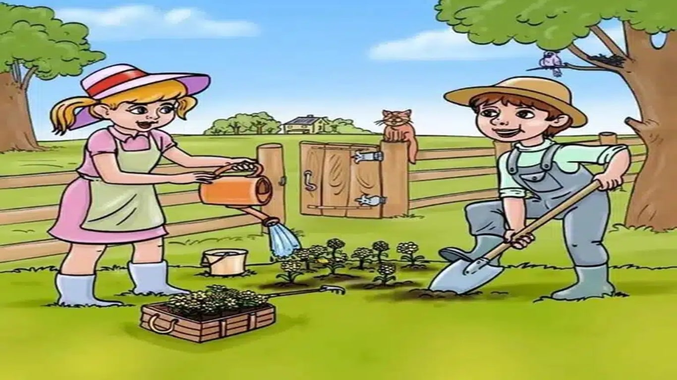Descubra o erro na imagem com a menina regando flores e o menino prepara a terra. Imagem: YouTube