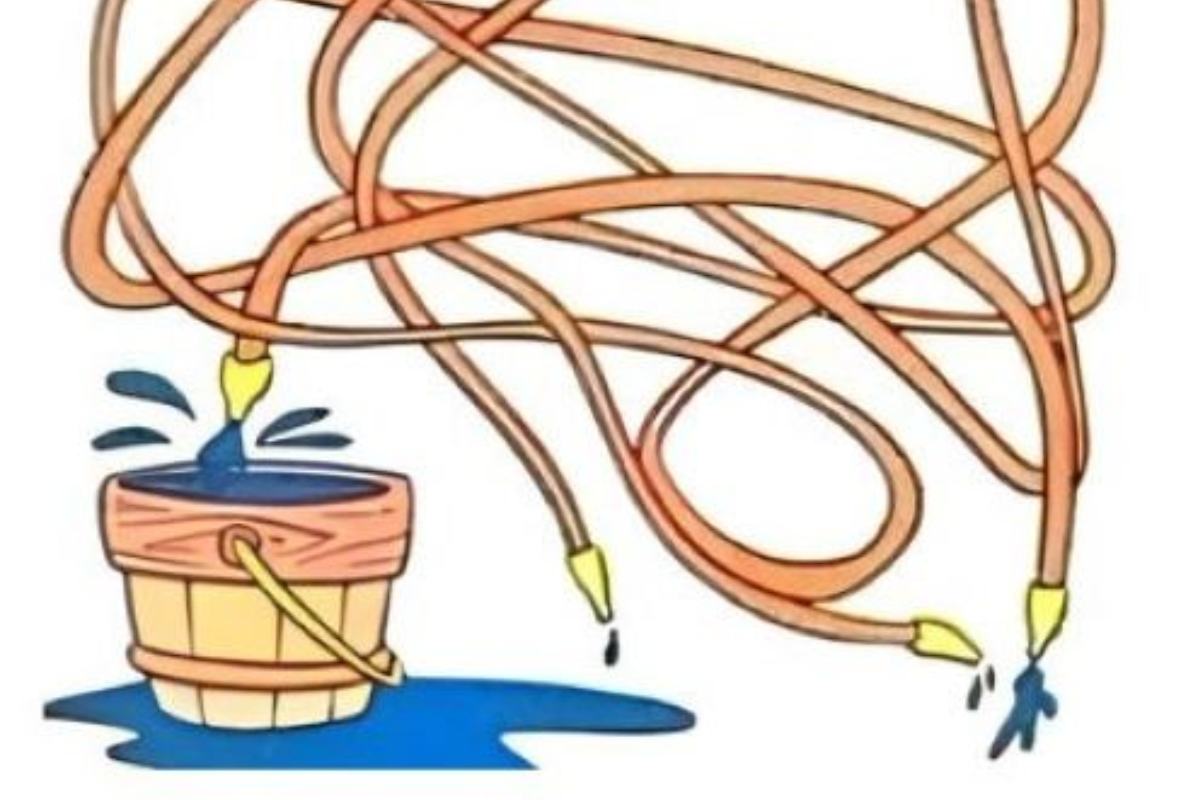 O desafio é simples: descobrir qual tubo está corretamente ligado ao balde e, portanto, qual deles está enchendo o recipiente. Para resolver o quebra-cabeça, é preciso seguir cuidadosamente o percurso de cada tubo desde a torneira até o balde, observando os caminhos e bloqueios.