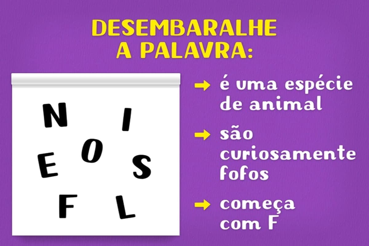 Prepare-se para o desafio de hoje, que vai testar sua percepção! Observe com bastante atenção, a imagem com letras embaralhadas N, I, E, O, S, F, L para formar nome de animal fofo que começa com F. Você consegue descobrir qual é a espécie neste desafio lógico em até 30 segundos?