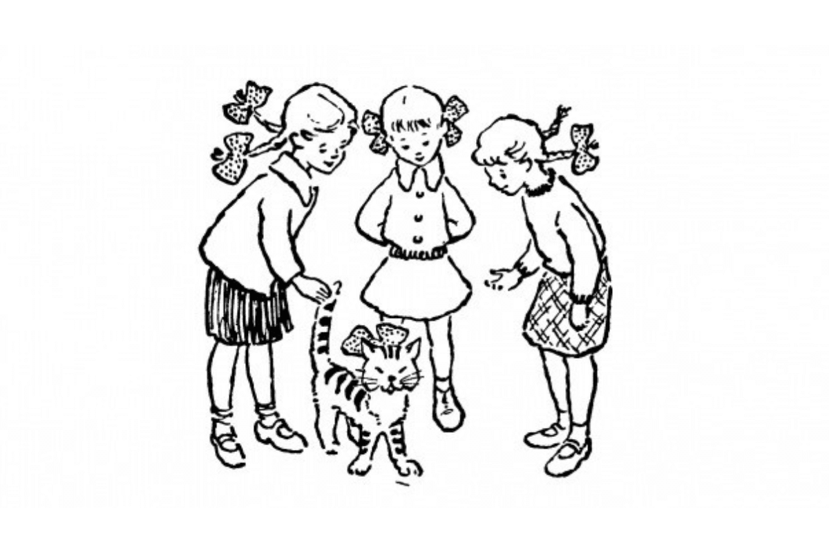 A imagem em preto e branco mostra três meninas em pé ao redor de um gato listrado. Cada uma delas tem laços nos cabelos, e o gato também está usando um laço semelhante em seu rabo. Todas parecem interessadas no animal, mas apenas uma delas é a verdadeira dona.