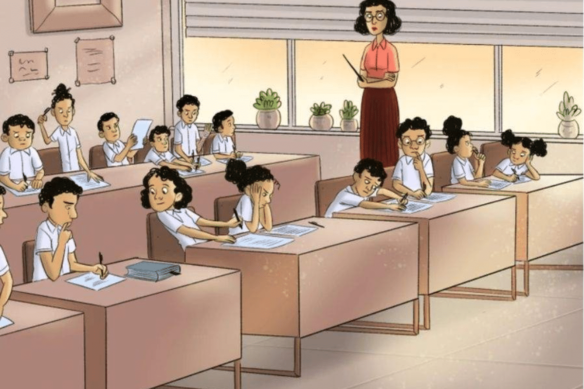 Se você está pronto para testar sua percepção, este teste de QI é ideal para você. Na imagem, vemos uma sala de aula animada, com alunos concentrados durante uma prova. No entanto, algo está errado: um dos alunos está usando estratégias questionáveis para colar. Seu desafio é simples — identificar rapidamente quem está trapaceando em apenas 5 segundos.
