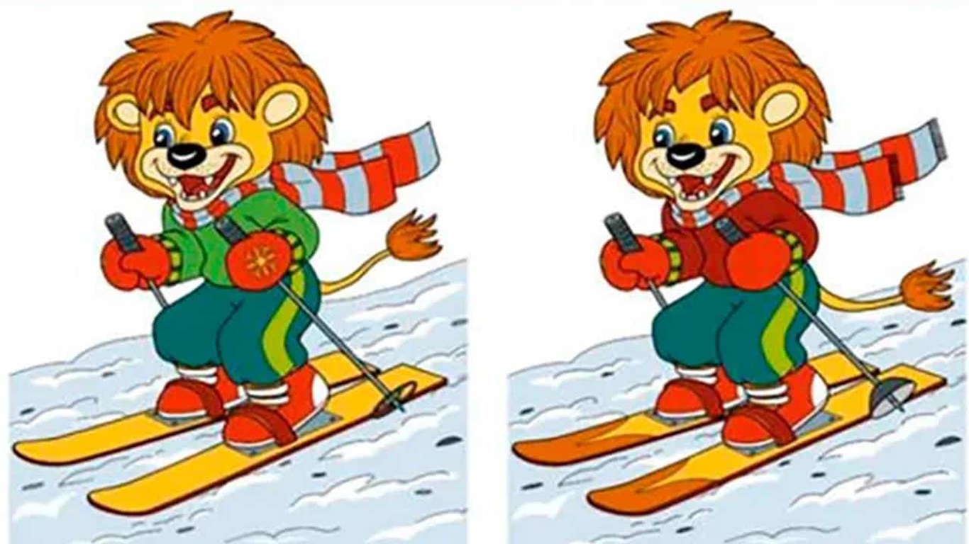 Agora vamos para resolução do teste de QI, abaixo você irá visualizar onde está localizado as OITO DIFERENÇAS na imagem representada por uma ilustração de um leão esquiando com duas versões da imagem.