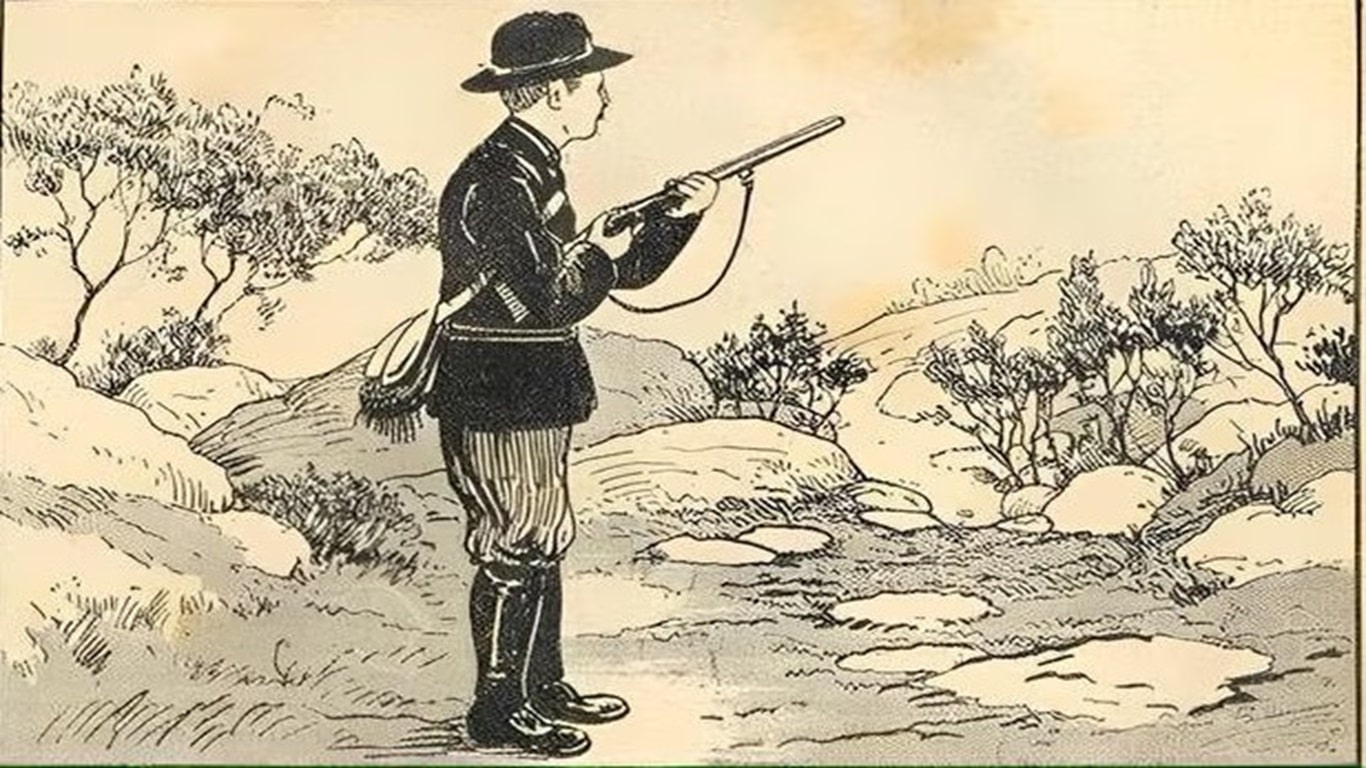 Teste de QI com uma ilustração antiga de um caçador com uma espingarda observando a paisagem ao seu redor.