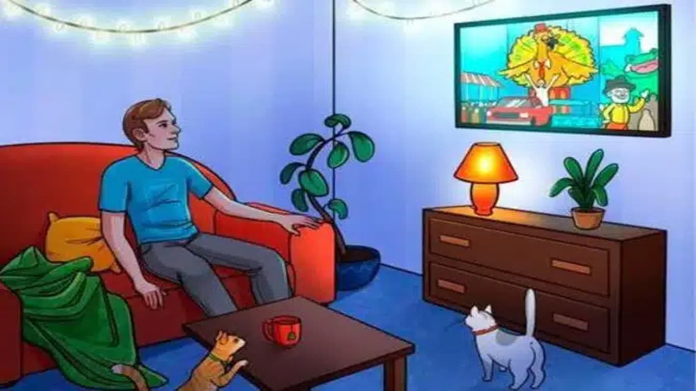 Neste teste de QI, a atenção ao detalhe é colocada à prova em um ambiente familiar e cotidiano. A imagem ilustrada mostra um homem relaxando enquanto assiste à TV, acompanhado por dois gatos, mas há algo fora do lugar que precisa ser identificado. Com apenas 20 segundos disponíveis, o participante deve observar minuciosamente todos os elementos da cena, como objetos, posicionamentos e interações entre os personagens, para encontrar o erro escondido. Este desafio estimula a percepção visual e a capacidade de raciocínio sob pressão, tornando a experiência mais interessante.