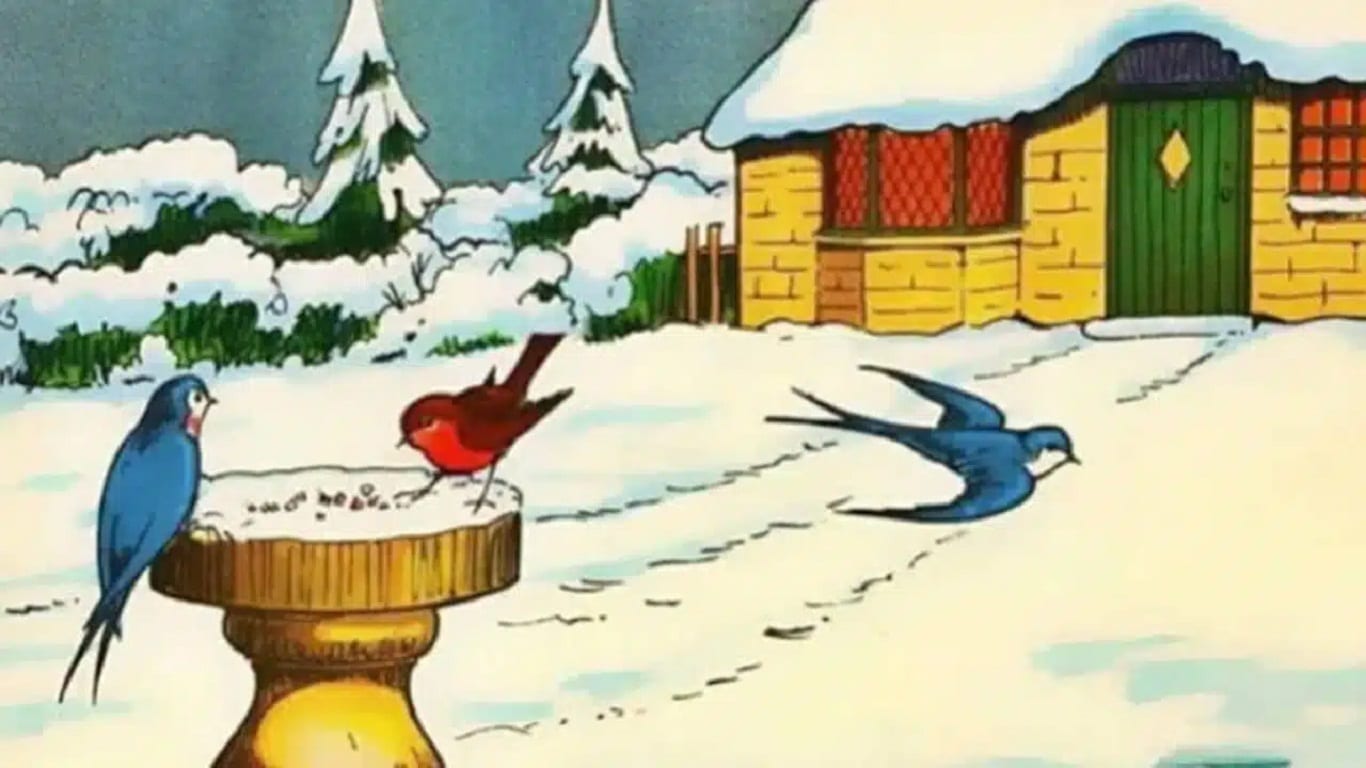 Agora vamos para resolução do teste de QI, na imagem abaixo você irá encontrar onde está localizado o ÚNICO ERRO na imagem representada uma cena de inverno com três pássaros em uma paisagem coberta de neve, com uma casa ao fundo..
