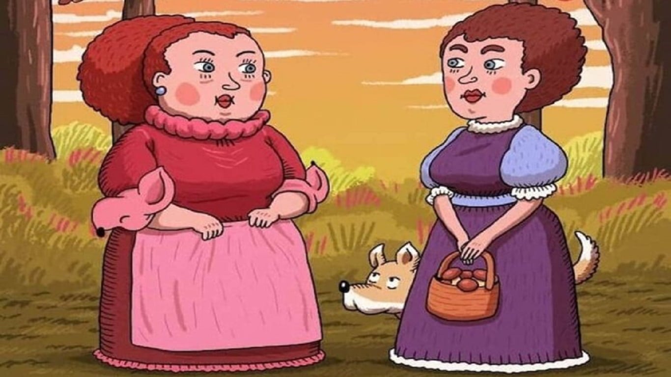 Agora vamos para resolução do teste de QI, abaixo você irá visualizar onde está localizado a CACHORRO ESCONDIDO na imagem representada por uma ilustração de duas mulheres em um cenário campestre com um cachorro escondido.