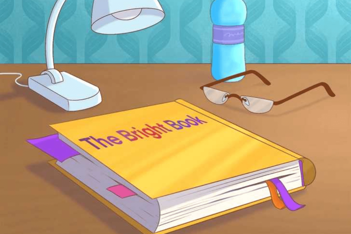 A imagem mostra uma mesa de trabalho simples, com um livro amarelo intitulado “The Bright Book” em destaque, óculos, uma garrafinha de água e uma lâmpada de mesa. O fundo é decorado com um padrão geométrico em tons de azul. O livro está aberto, com marcadores de página visíveis e organizados.