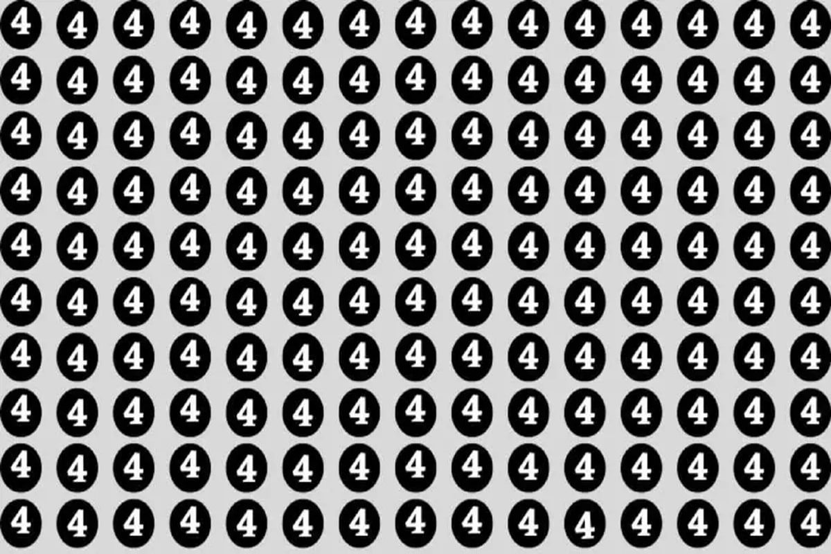 Prepare-se para o desafio de hoje, que vai testar sua percepção! Observe uma imagem composta por uma repetição de círculos pretos com o número 4 em branco, dispostos de forma organizada em linhas e colunas.