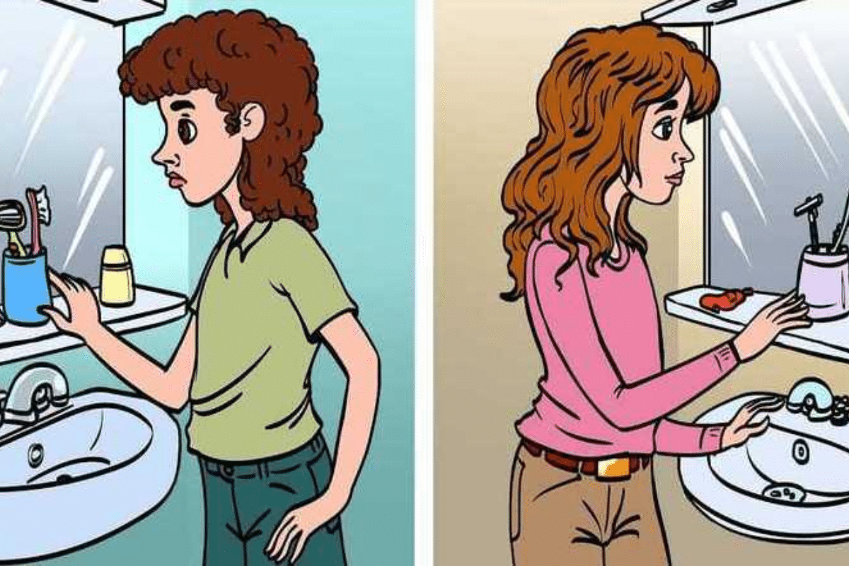 A resposta para o teste de QI está nos detalhes do banheiro de cada personagem. No lado esquerdo da imagem, próximo ao espelho, é possível ver um barbeador feminino, um frasco de desodorante e alguns outros itens de higiene. Esses objetos são pistas que indicam que essa pessoa é a mulher.