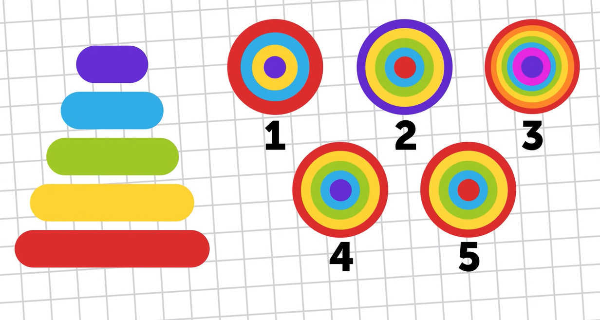 A imagem apresenta um brinquedo de empilhar com cinco camadas de cores: vermelho, amarelo, verde, azul celeste e roxo, dispostas de baixo para cima. Ao lado, há cinco opções de círculos concêntricos numerados de 1 a 5, cada um representando uma possível sequência das cores vistas de cima.
