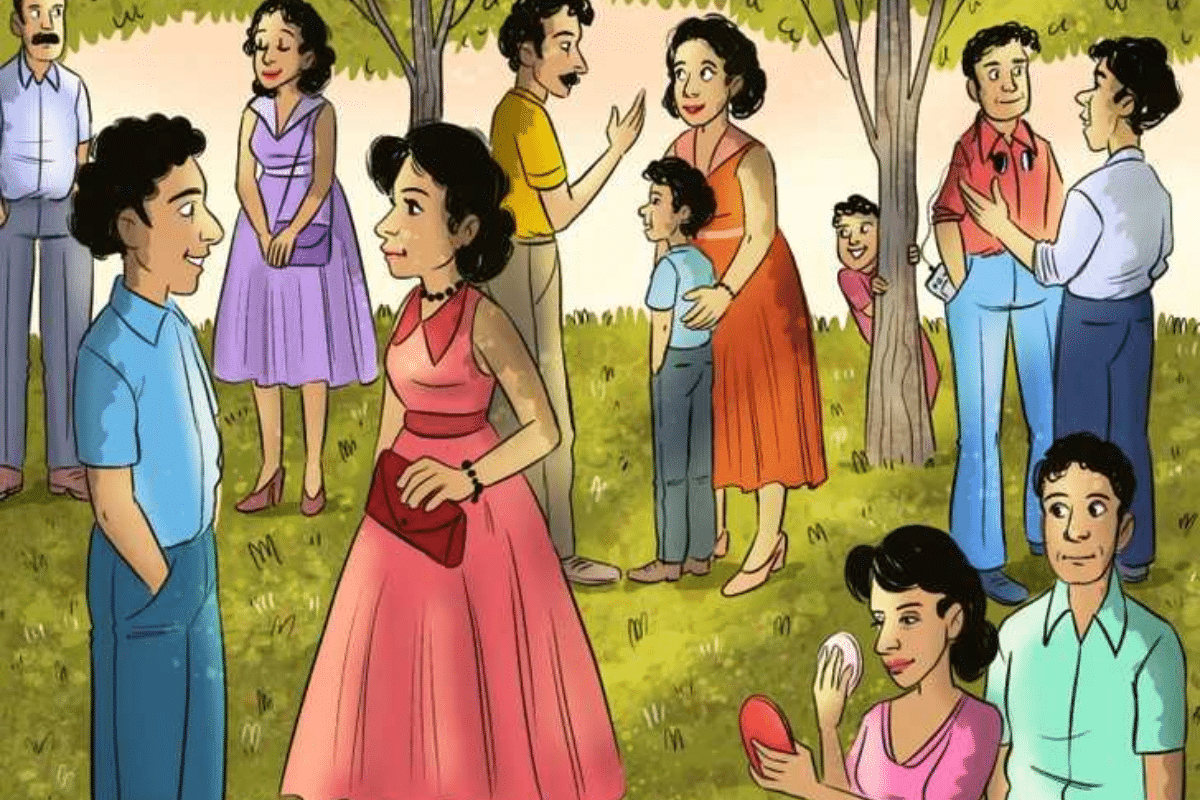 A imagem retrata uma cena de festa ao ar livre, com diversas pessoas interagindo em um ambiente típico da década de 1950. Homens e mulheres estão elegantemente vestidos, e crianças aparecem brincando no fundo. Cada grupo está engajado em conversas ou atividades típicas da época, criando um cenário tranquilo e alegre.