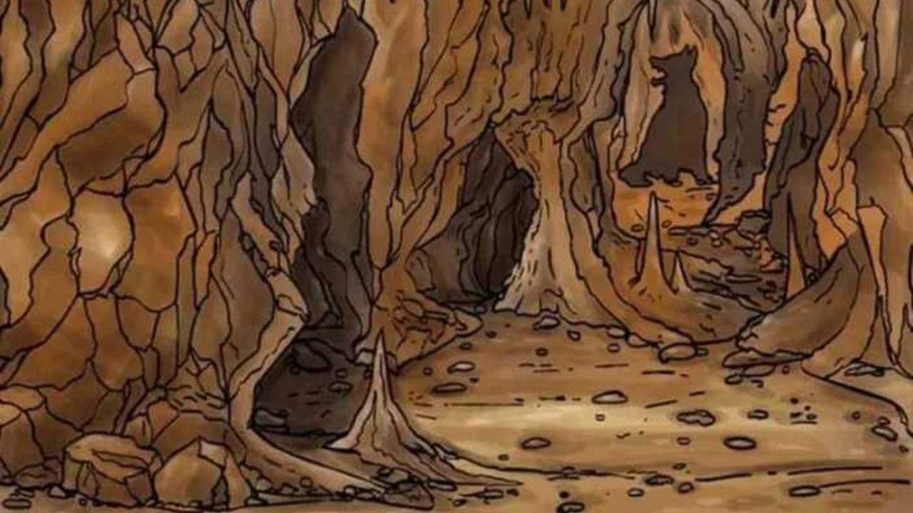 A imagem mostra o interior de uma caverna com diversas formações rochosas. Porém, entre essas pedras, há um cachorro disfarçado. Você consegue localizá-lo em menos de 23 segundos? Preste atenção aos pequenos detalhes e olhe com calma cada parte da imagem antes que o tempo acabe.