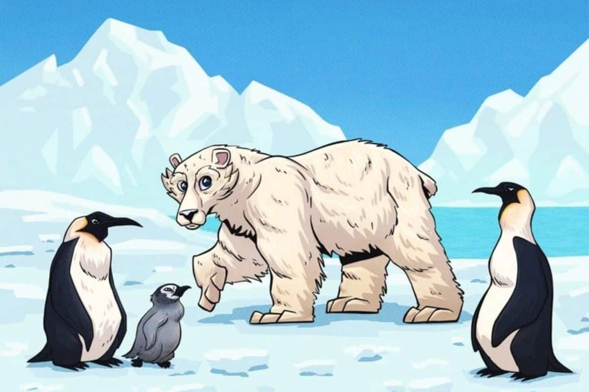 A imagem retrata uma cena em uma região polar com gelo ao fundo. No centro, há um urso polar cercado por quatro pinguins, incluindo um filhote. À primeira vista, a composição parece normal, mas há um erro sutil que desafia a lógica da cena.