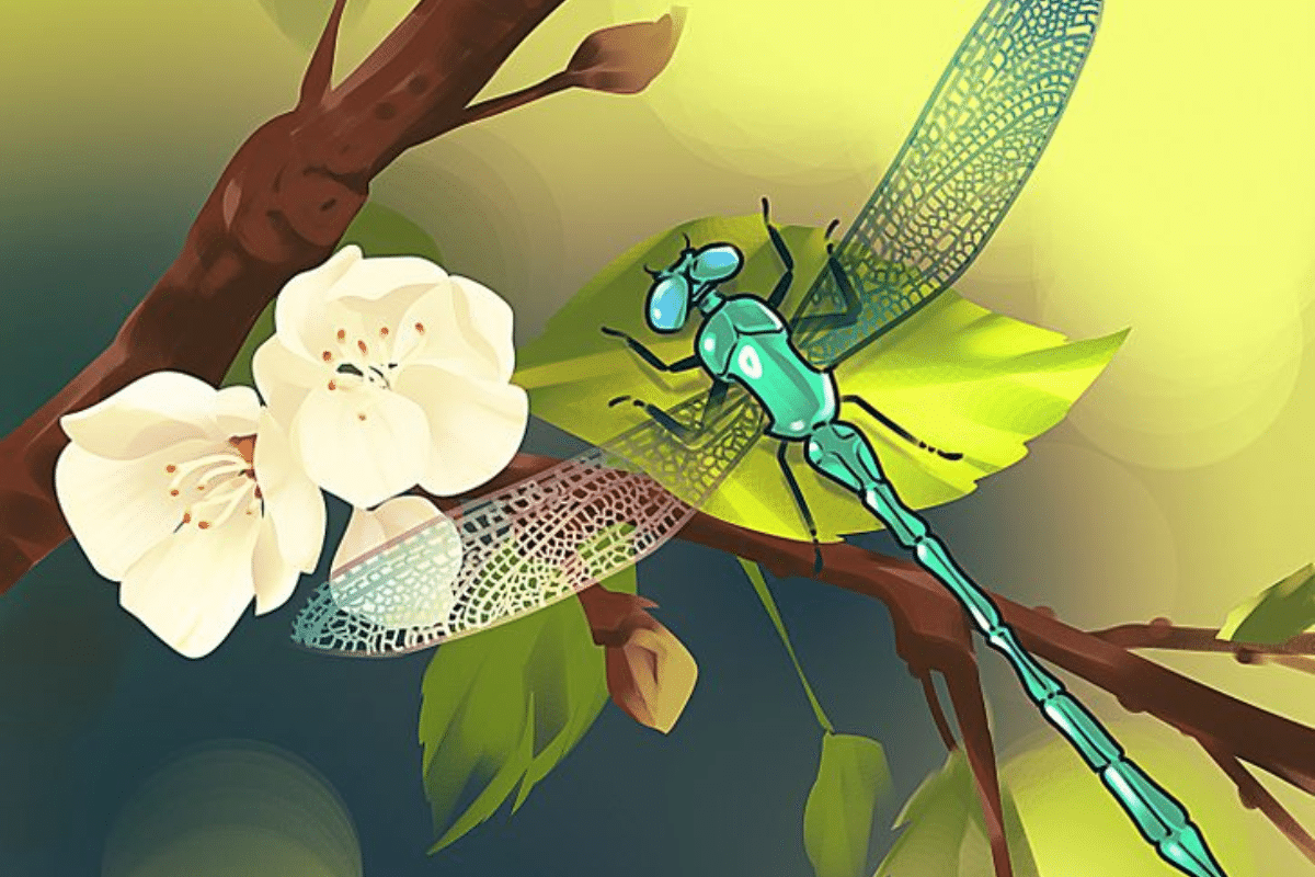 A imagem que você verá agora contém uma libélula pousada sobre um galho com flores brancas. No entanto, há algo de errado com ela. Seu desafio neste teste de QI é identificar esse erro escondido.
