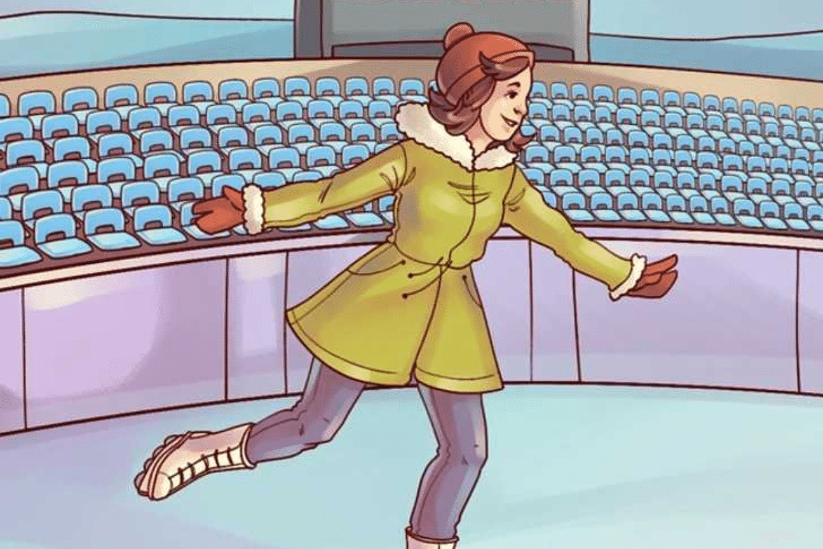 Ela está patinando no gelo, mas em vez de usar patins de lâmina, está calçando patins de rodinhas, que são apropriados para superfícies sólidas como o asfalto. Isso torna a cena impossível, pois patins de rodinhas não funcionam em uma pista de gelo.