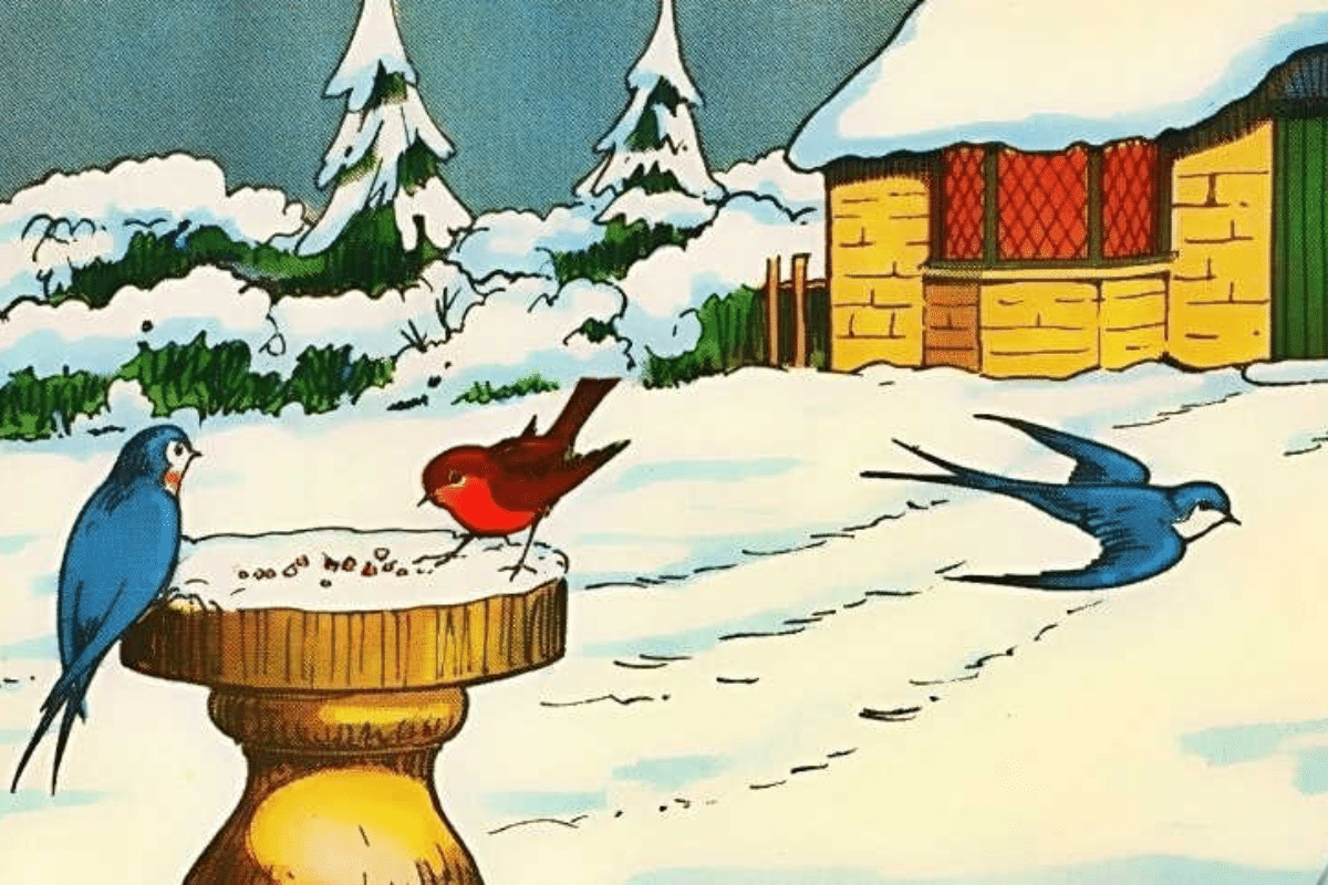 A imagem mostra uma cena de inverno com uma casa aconchegante, cercada por árvores cobertas de neve. Há também um comedouro de pássaros, onde um pássaro azul está comendo enquanto um pássaro vermelho observa. No fundo, outro pássaro azul está voando para longe. O cenário é tranquilo e bonito, mas algo está fora do lugar.