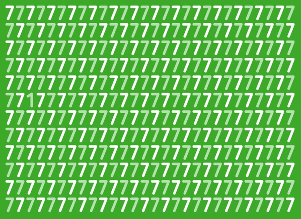 Prepare-se para o desafio de hoje, que vai testar sua percepção! Observe com bastante atenção, a imagem mostra vários números sete brancos em fundo verde, com um número diferente. Você consegue achar o número 1 camuflado em até 25 segundos?