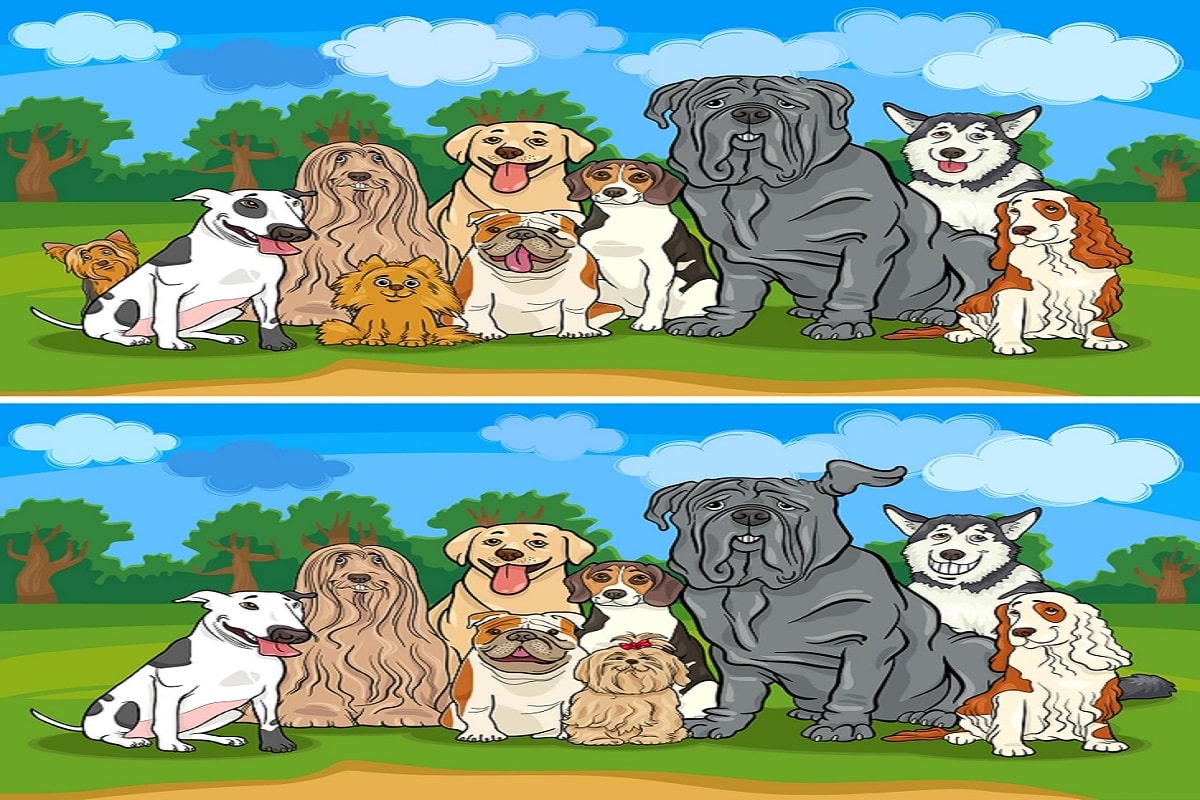 Prepare-se para o desafio de hoje, que vai testar sua percepção! Observe com bastante atenção, a imagem mostra diversos cachorros posando juntos em um parque verde. Você consegue achar todas as diferenças em até 25 segundos?