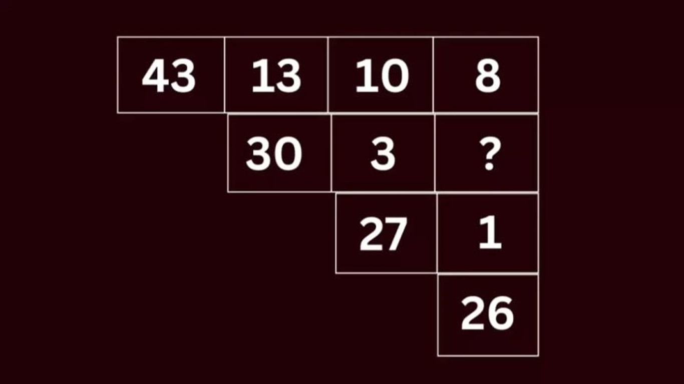 Preste a atenção que: 43 – 13 (os dois primeiros números da linha 1) é igual a 30 (primeiro número da linha 2).