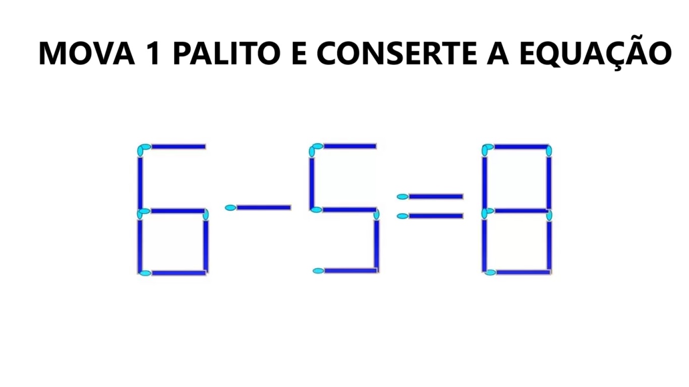 Para corrigir a equação “6 – 5 = 8” movendo apenas um palito de fósforo, você pode transformar o “5” em “6”. Mova o palito do número 8 para o número 5, assim o número 8 se torna o número 0 e o número 5 se torna o número 6. Assim, a equação correta fica “6 – 6 = 0”.