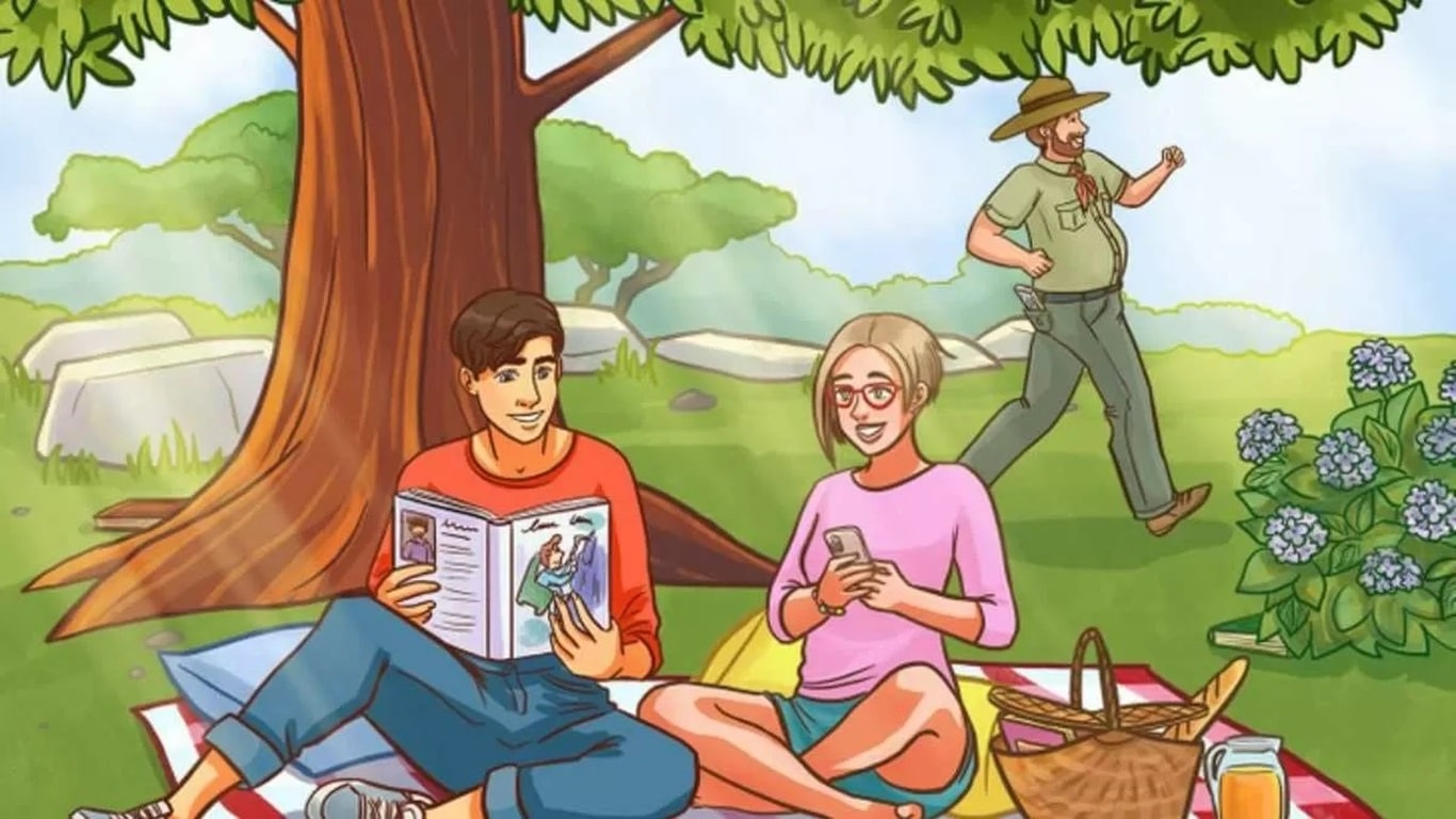 Localize todos os livros enquanto o casal aproveita um dia ensolarado no parque, Imagem: YouTube