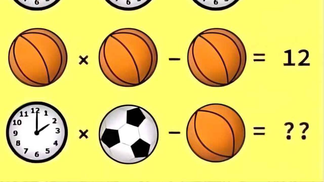 Na imagem abaixo, você verá um quebra-cabeça com relógios, bolas de futebol e bolas de basquete. A tarefa é encontrar o valor da equação em 30 segundos. Este teste vai avaliar suas habilidades analíticas e de pensamento lógico.