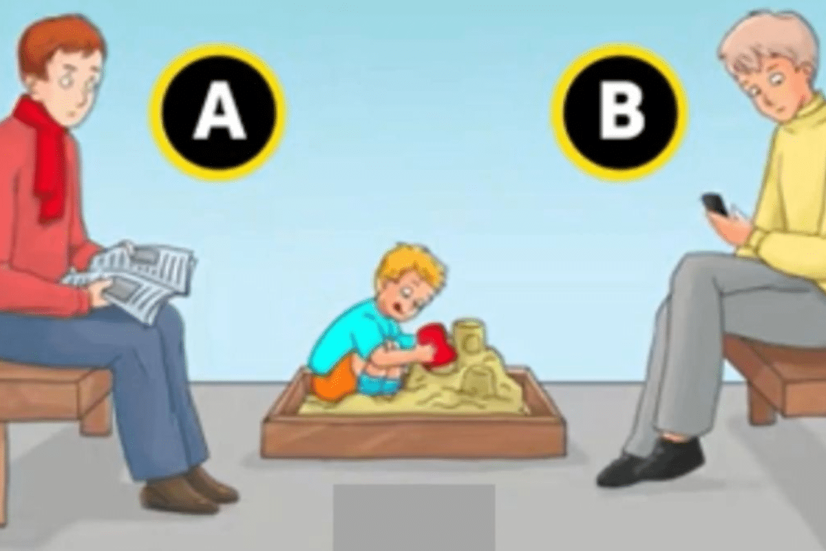 Na imagem, vemos uma criança brincando animadamente em uma caixa de areia. Ao lado dela, estão dois homens sentados em bancos opostos: o homem A, à esquerda, veste uma blusa vermelha com cachecol e segura um jornal; o homem B, à direita, usa uma blusa amarela e está concentrado no celular. Ambos parecem adultos que poderiam estar acompanhando a criança, mas apenas um deles é o pai verdadeiro.