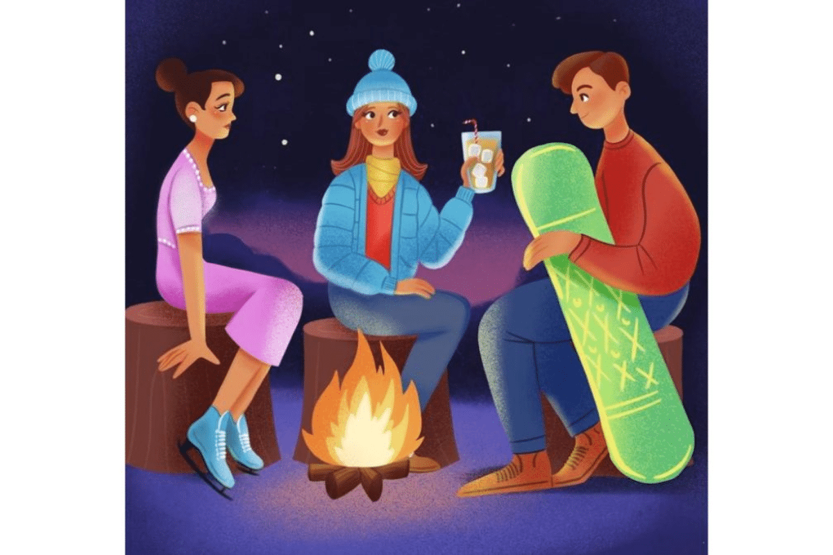 A imagem mostra três amigos sentados ao redor de uma fogueira em um acampamento durante a noite. Cada um deles tem um elemento que representa sua atividade do dia: uma mulher usa patins de gelo, outra veste roupas de inverno e segura um copo com uma bebida gelada, enquanto o terceiro carrega um snowboard.