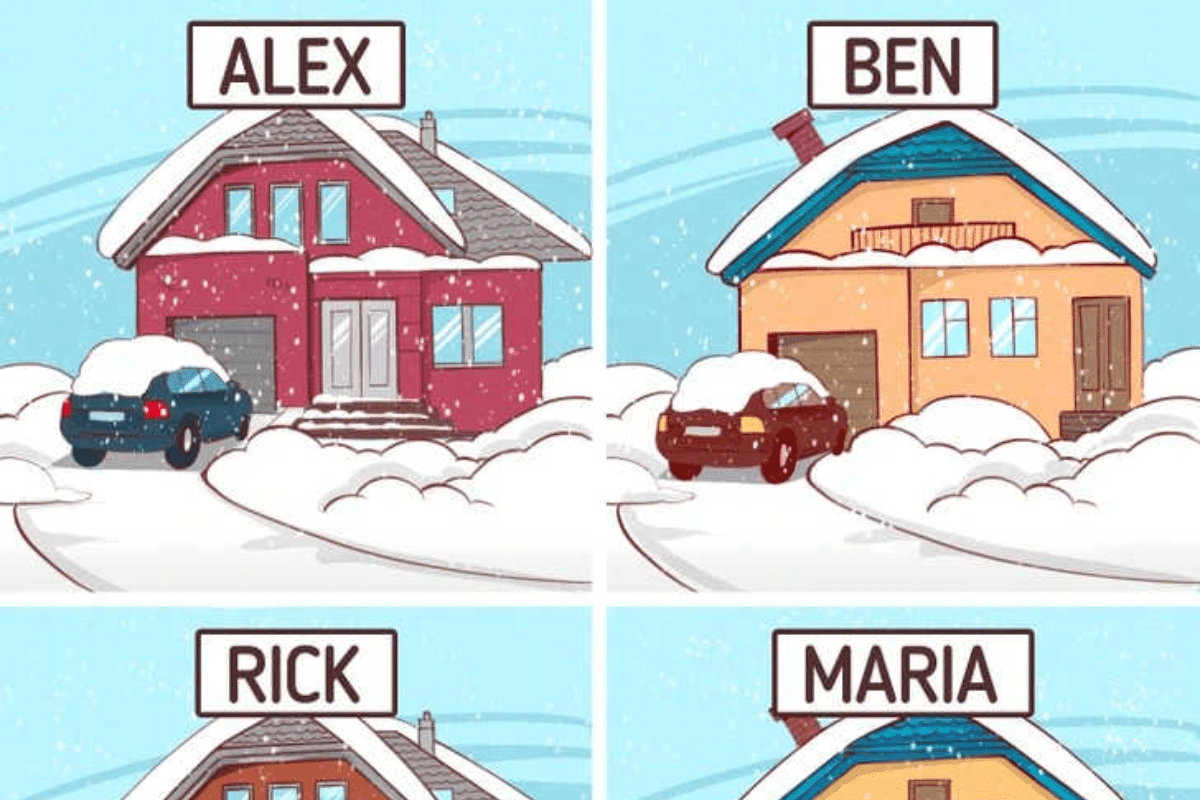 A imagem mostra quatro casas cobertas de neve, cada uma pertencente a uma pessoa: Alex, Ben, Rick e Maria. Em frente a cada casa, há um carro estacionado. Apesar da aparência tranquila, há um detalhe importante que revela quem esteve fora enquanto nevava.