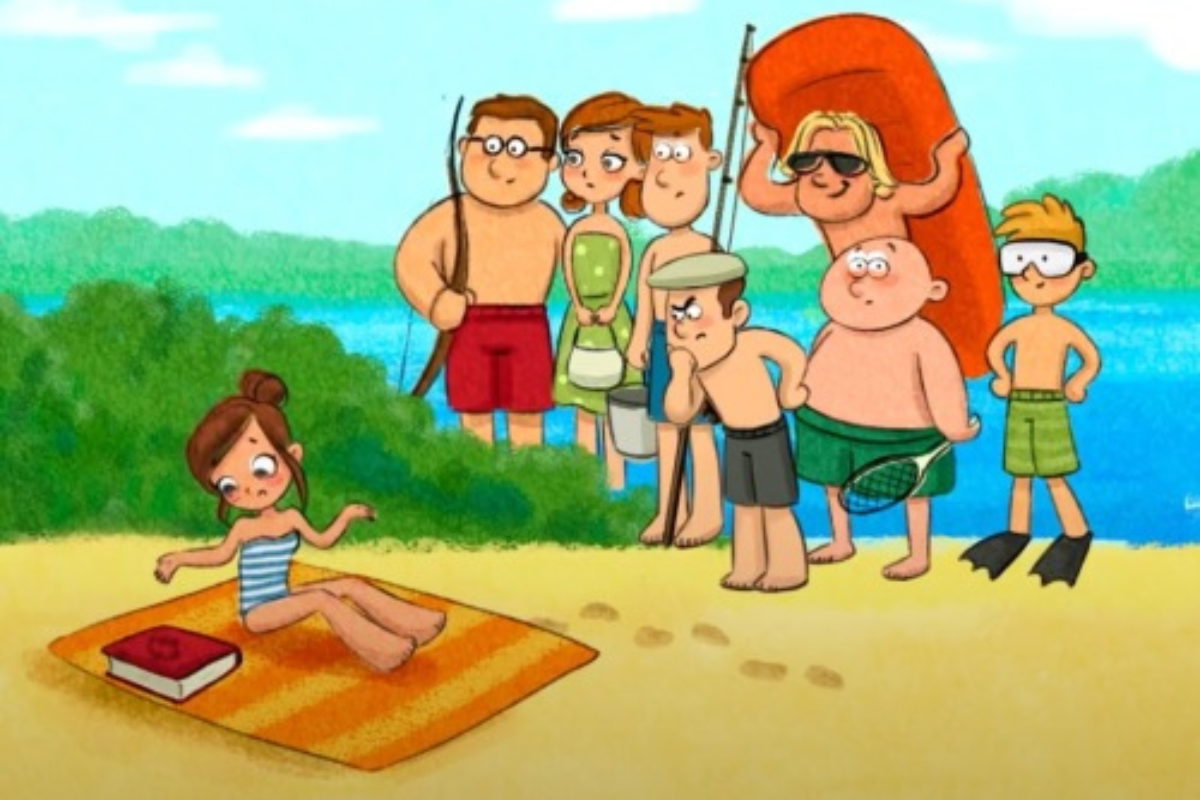 A imagem apresenta uma cena em uma praia, onde uma garota está sentada em uma toalha, claramente angustiada, olhando para o chão, aparentemente em busca de sua pulseira perdida. Ao fundo, um grupo de pessoas observa a situação, incluindo um pescador com uma vara de pescar, um homem com óculos de sol, um jovem com equipamento de mergulho, e outros personagens que parecem intrigados.