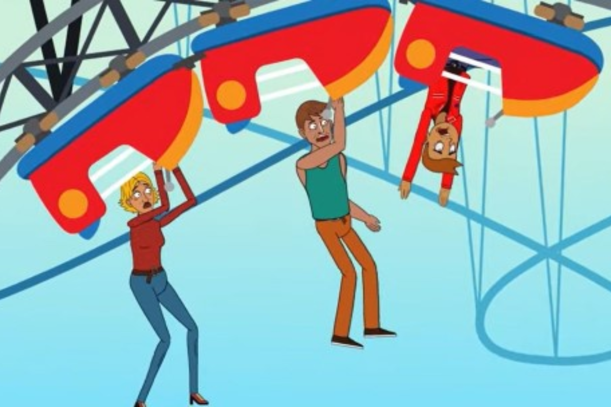 Na imagem, vemos três pessoas penduradas em uma montanha-russa, cada uma em uma posição tensa e arriscada. O cenário é caótico, pois todos estão se segurando para evitar uma possível queda. A pessoa à esquerda, de cabelo loiro e calça jeans, segura firmemente a estrutura da montanha-russa com ambas as mãos, com uma expressão de medo evidente no rosto.