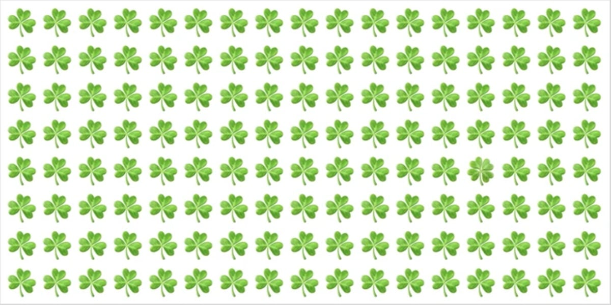 Prepare-se para o desafio de hoje, que vai testar sua percepção! Observe com bastante atenção, a imagem mostra  uma matriz de trevos verdes de três folhas, distribuídos de maneira uniforme sobre um fundo branco. Você consegue achar o único trevo fora do padrão em até 10 segundos?