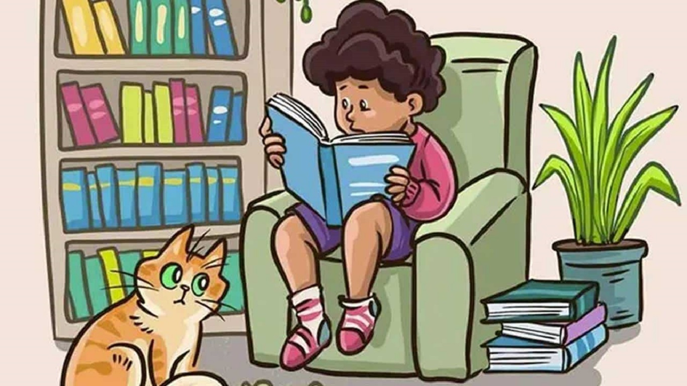 Agora vamos para resolução do teste de QI, na imagem abaixo você irá encontrar onde está localizado o ÚNICO ERRO na imagem representada por imagem de uma criança sentada em uma poltrona, com um livro nas mãos, um gato ao lado e uma estante de livros ao fundo.