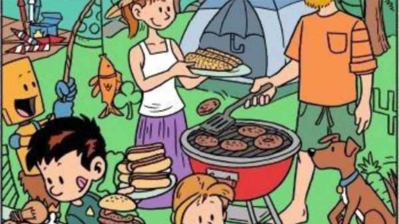 A imagem apresenta uma cena animada de um piquenique em família ao ar livre. Nela, há várias pessoas e um cachorro, todos participando de um churrasco. Ao fundo, há uma barraca de camping azul, algumas árvores, e um barco ancorado no lago próximo. Mas não se distraia, a tarefa é encontrar a tartaruga escondida.