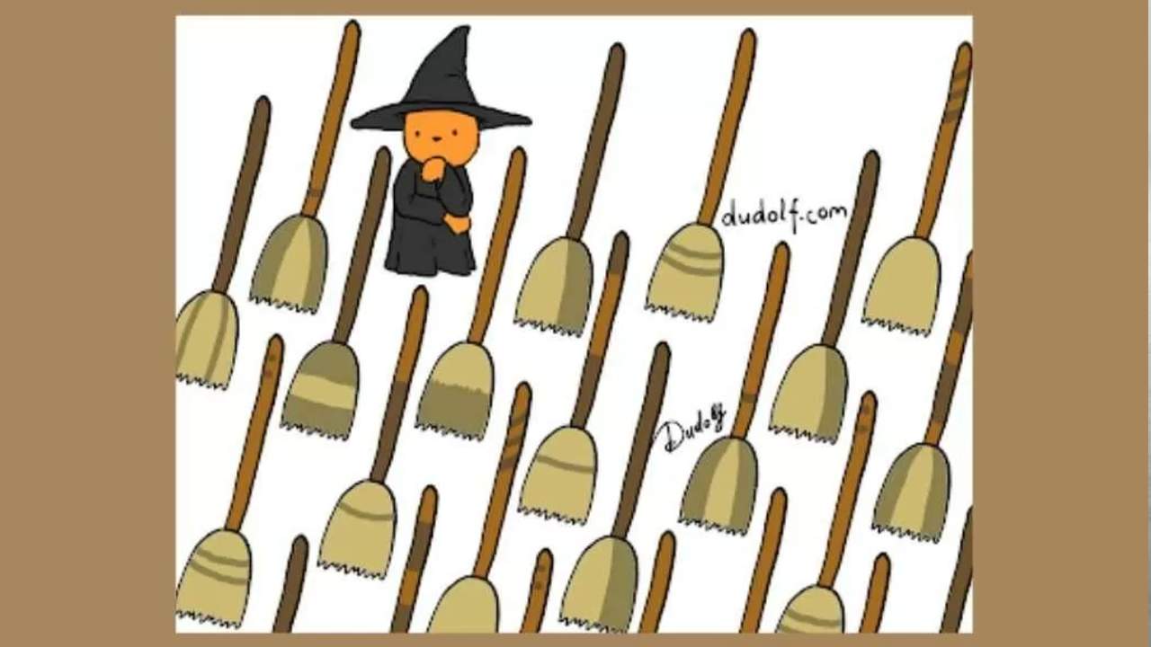A imagem apresenta um desafio visual em que várias vassouras estão dispostas de maneira aleatória. No canto superior esquerdo, há uma figura de uma pessoa vestida como uma bruxa. Todas as outras vassouras parecem semelhantes, o que torna o desafio encontrar a vassoura que não corresponde às outras.