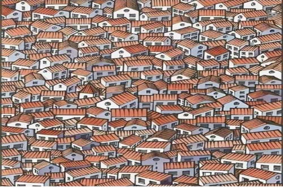 A cena apresenta um conjunto de casas alinhadas, todas com telhados vermelhos, formando um cenário cheio de elementos semelhantes. As casas possuem poucas diferenças nas janelas e portas, o que cria um padrão visual que pode confundir e dificultar a identificação do gato.