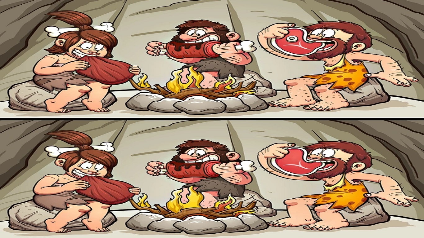 Prepare-se para o desafio de hoje que vai testar sua percepção! Observe com bastante atenção a imagem com um desenho humorístico de dois personagens pré-históricos sentados em volta de uma fogueira comendo carne. Existe oito diferenças entre as imagens para você identificar. Você consegue achar todas as diferenças em até 20 segundos?