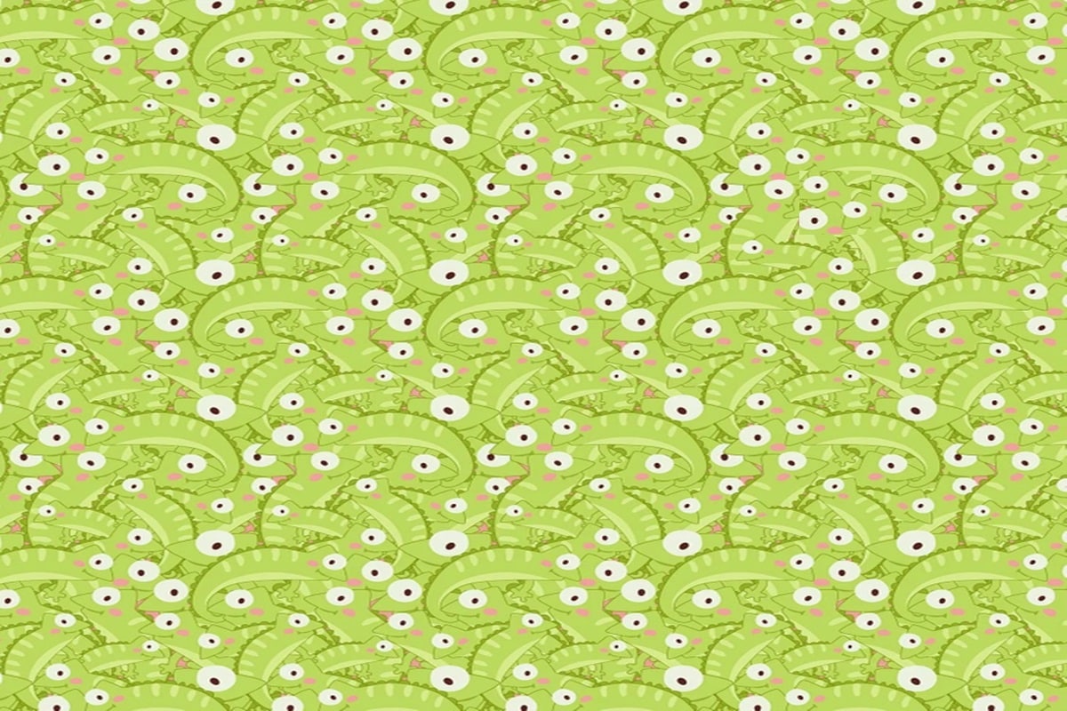 Prepare-se para o desafio de hoje, que foi projetado para avaliar sua percepção. Observe a imagem com um padrão colorido que apresenta várias iguanas verdes desenhadas de forma repetitiva. Sua missão será identificar o cavalo-marinho camuflado na imagem em até 20 segundos.