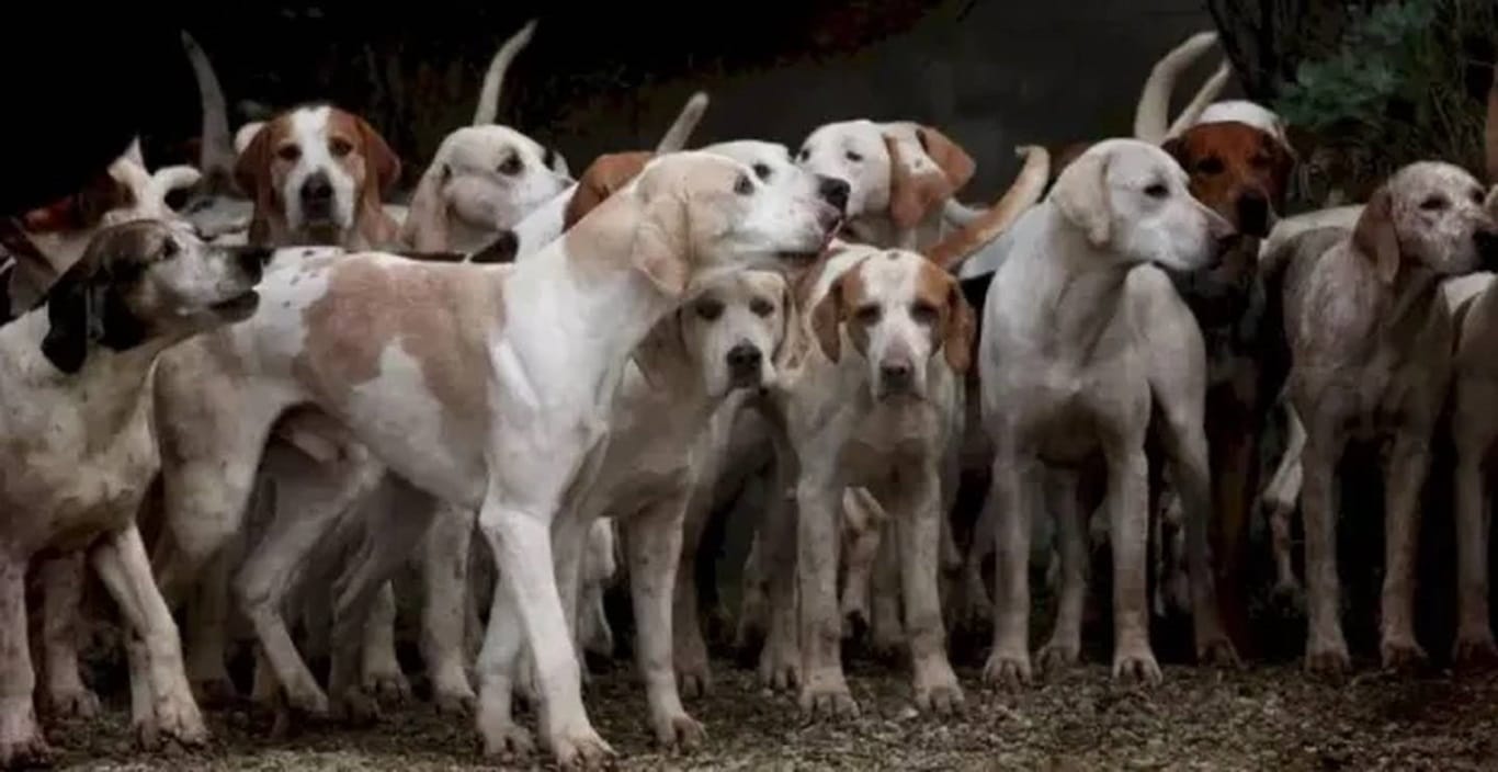 Grupo de cães de caça agrupados em uma área externa, em destaque um cão branco com manchas marrons.
